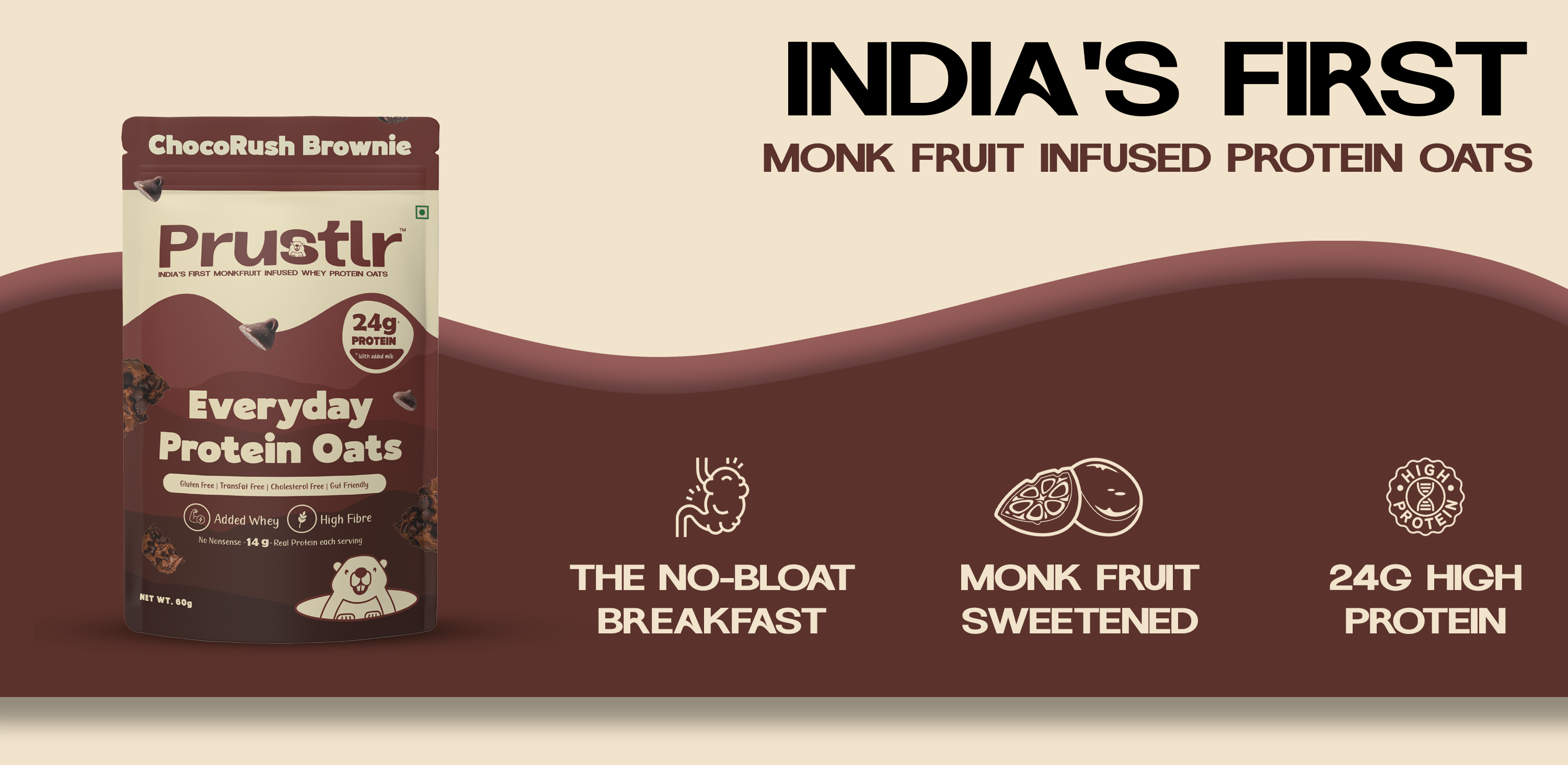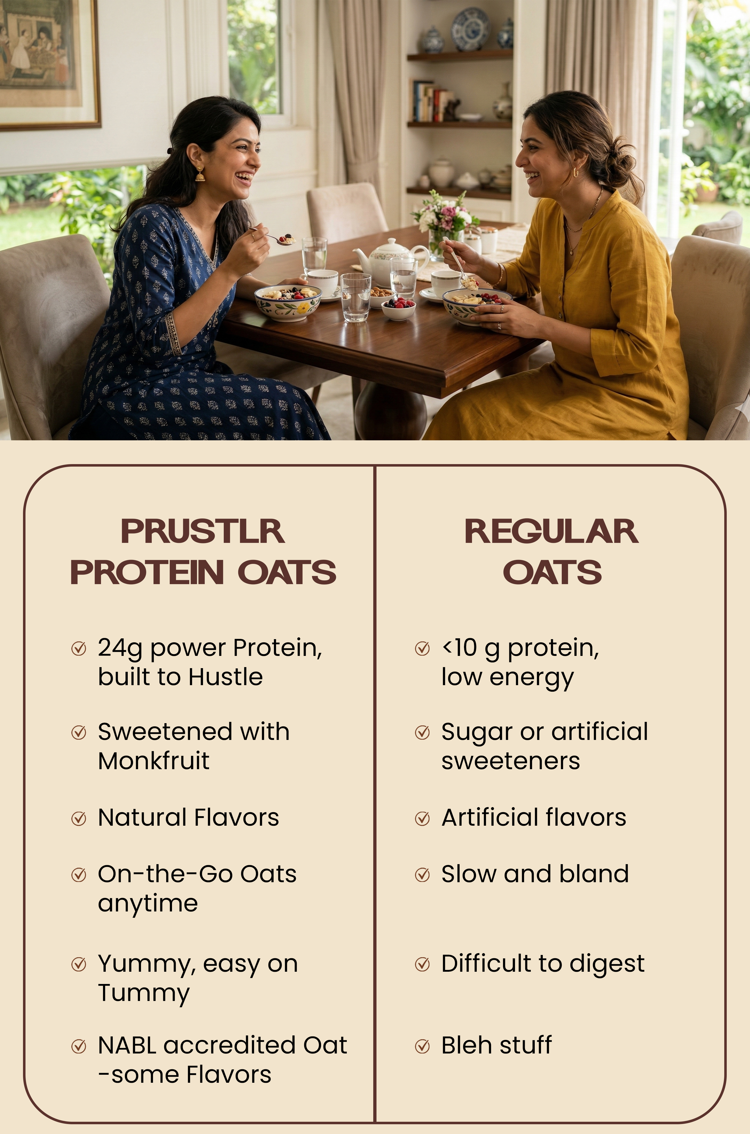 Prustlr Everyday Protein Oats are premium, ready-to-eat oats made with natural, clean-label ingredients. Unlike regular oats, ours are packed with gut-friendly nutrients, gluten-free, and zero added preservatives - all without losing any flavor. Just soak, chill, and enjoy.